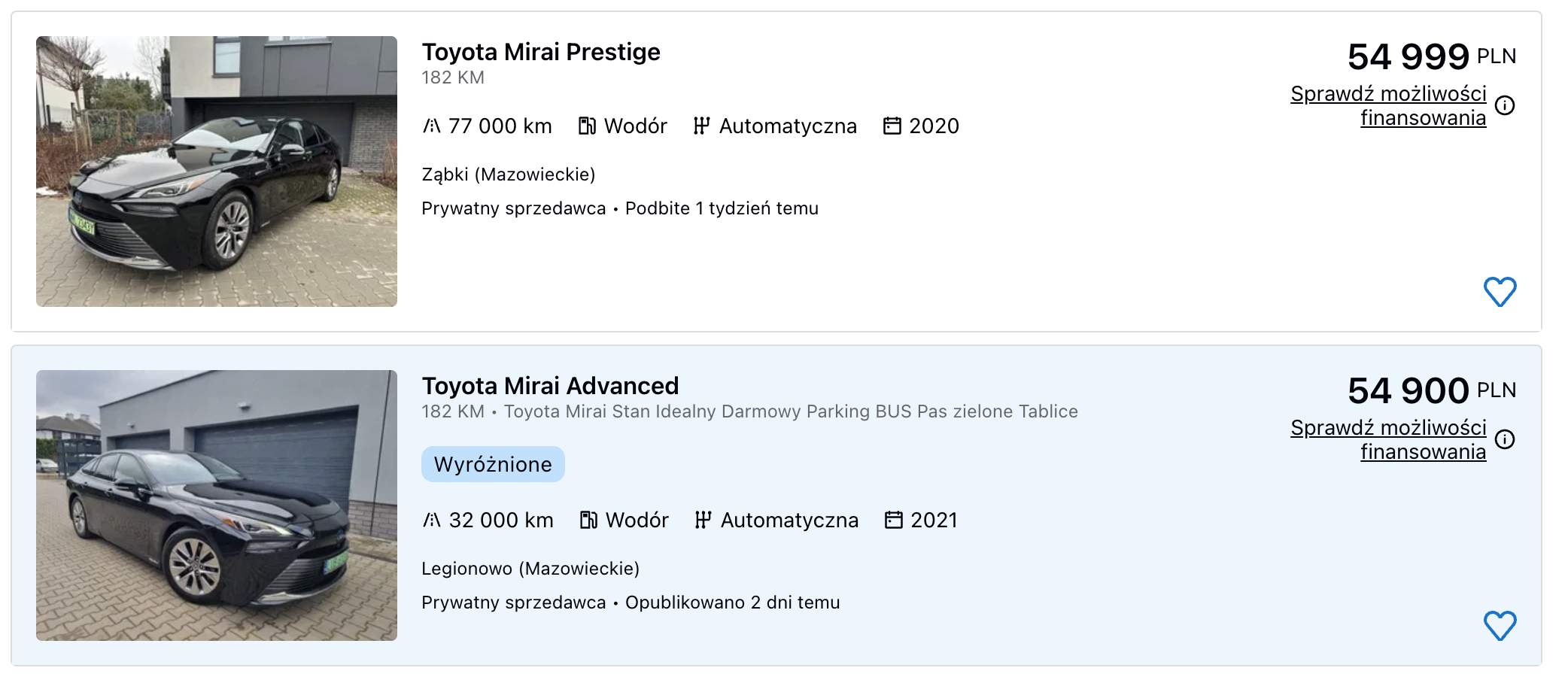 Jeszcze niedawno wybrani dealerzy sprzedawali fabrycznie nowe egzemplarze tego samochodu z gigantycznymi rabatami. Mowa tutaj o kwotach, które były niższe od pierwotnych nawet o 2/3. Teraz na rynku jest kilka samochodów w zaskakująco niskich cenach. Mowa wciąż o pojazdach z polskiej dystrybucji, mających po 3-5 lat. Ich ceny zbliżają się już do granicy 100 000 złotych, a pojazdy z importu kosztują... połowę tej kwoty. Toyota Mirai, generalnie rzecz biorąc, jest praktycznie nie do sprzedania.