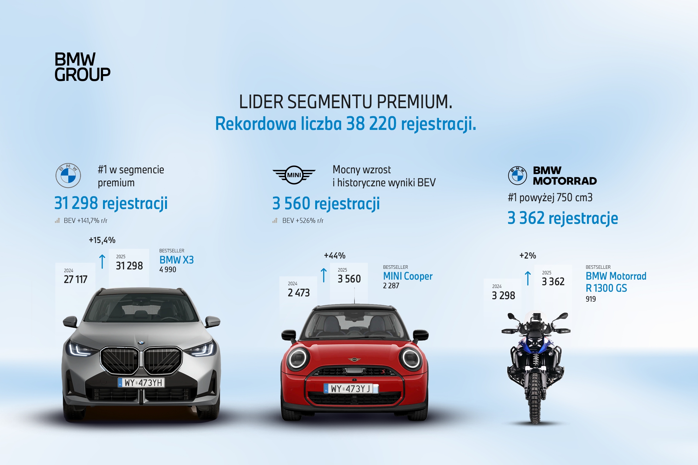Bestsellerami BMW M Performance zostały BMW X3 M50 (507 rejestracji, +705% względem 2024 r.) oraz BMW M340i (430 rejestracji, +12% w skali rok do roku). Łącznie mówimy o 4 243 samochodach z gamy M Performance i M High Performance.