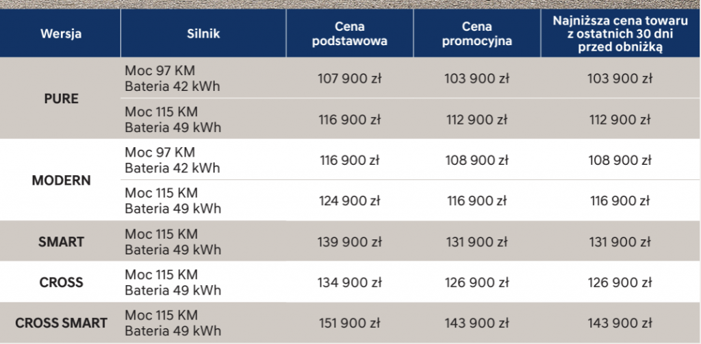 Bazowa korzysta z baterii o pojemności 42 kWh i z 97-konnego silnika. W mojej opinii to więcej niż wystarczająca wartość, gdyż i tak dostajemy tutaj blisko 330 kilometrów zasięgu na ładowaniu. Bazowa wersja Pure oferuje w zupełności wystarczające wyposażenie, z automatyczną klimatyzacją, multimediami z Apple CarPlay/Android Auto, kompletem systemów ADAS, czy nawet z kamerą cofania i z adaptacyjnym tempomatem.