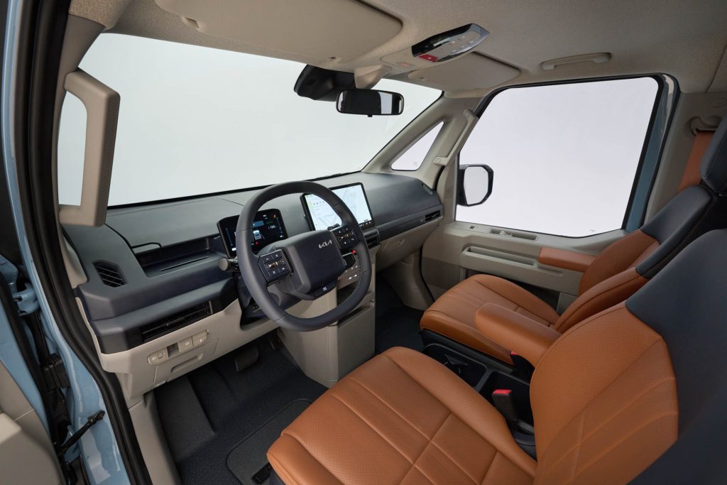 Kokpit PV5 składa się z 7-calowego wyświetlacza zegarów i 12,9-calowego ekranu multimediów. Znajdziemy tutaj nowe oprogramowanie, które bazuje na systemie Android Automotive OS. Użytkowa KIA będzie rzecz jasna wyposażona w aktualizacje OTA i dostęp do sieci.
