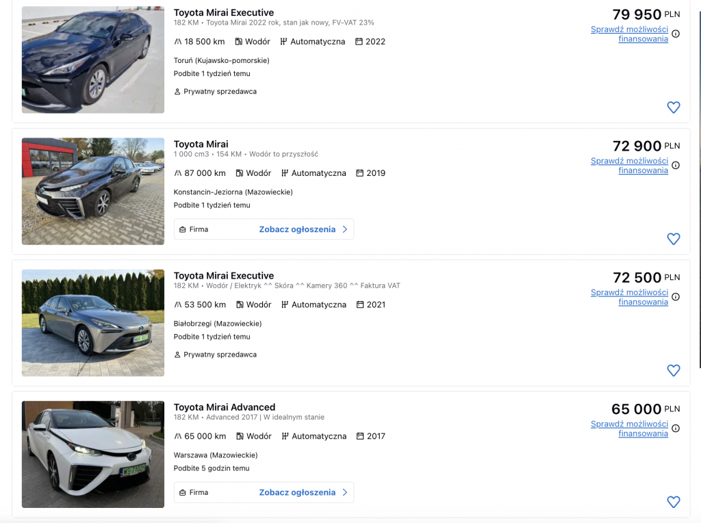 Przykładów nie trzeba szukać daleko. Toyota Mirai z rocznika 2021, mająca 30 000 km przebiegu, wymaga wydania 99 000 złotych. Na jednym z portali ogłoszeniowych znajdziemy też samochód o rok młodszy, z przebiegiem 25 000 km, za raptem 84 900 złotych. Obydwa auta pochodzą z USA, więc mogą być powypadkowe.