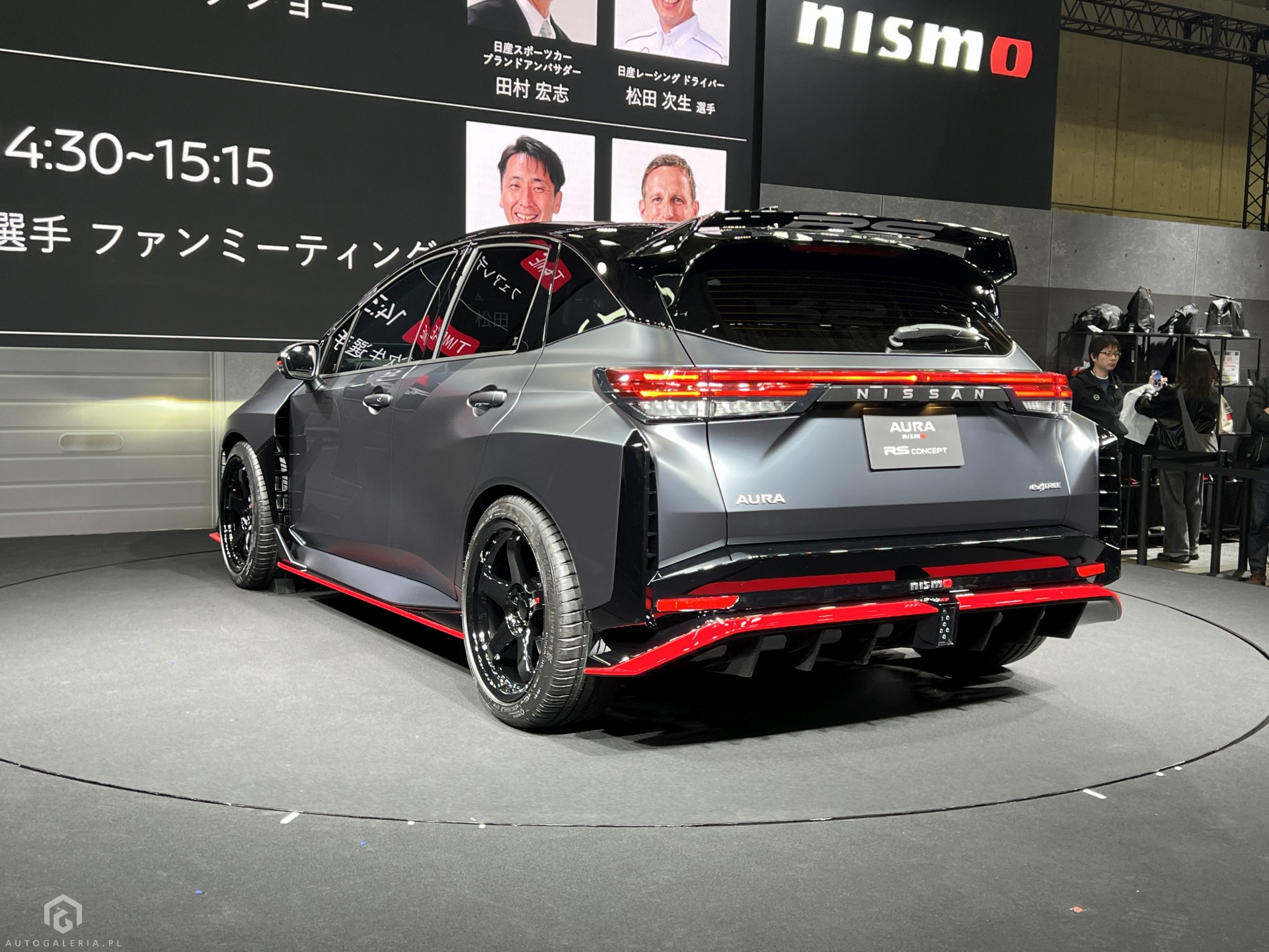 Do tego... o matko jak to wygląda. Spece z Nissana postawili na odważne zmiany w wyglądzie. Choć Aura sama w sobie jest czymś między hatchbackiem a minivanem, to Nissan Aura Nismo RS wygląda naprawdę jak rasowe auto. Poszerzenia (samochód jest szerszy aż o 145 mm), spoiler, dokładki. Jest nieco przesadzony, ale na żywo robi świetne wrażenie. Do tego uzupełnione to jest dobrymi felgami i czerwonymi wstawkami na szaro-czarnym nadwoziu. Świetny projekt, jak na targi tuningowe i jak na zapowiedź sportowych modeli.
